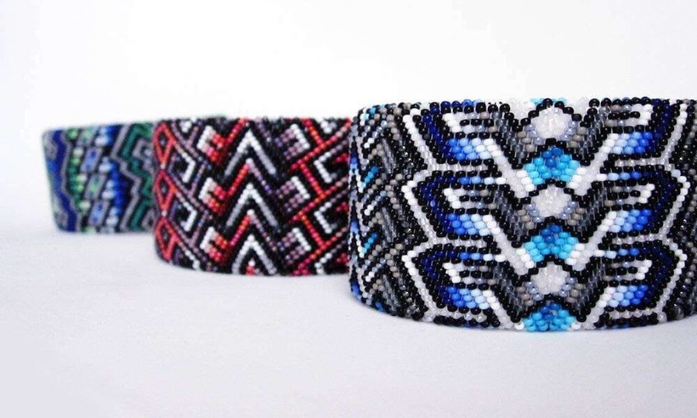 My first project was a small container, and I remember my father laying out his collection of beaded handles in front of me as a way to spark some patterns to implement into my work. He passed on his collection of charlotte cut beads, which were kept neatly in different containers, organized by their colors. I gladly accepted his collection, and as far as designs go, my main motivation was to bead designs that no one else beaded. I wanted to get away from the old school style of beading peyote stitch and I wanted to incorporate the bright colors that were being used in everyday pop culture.