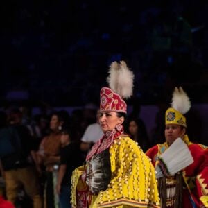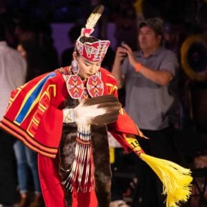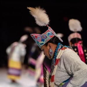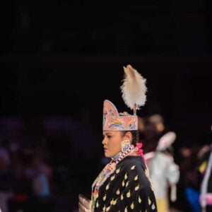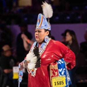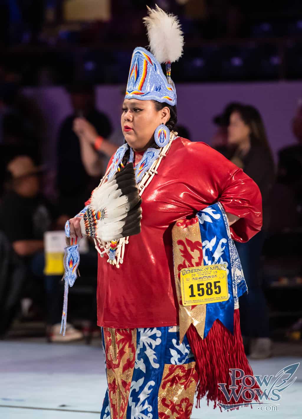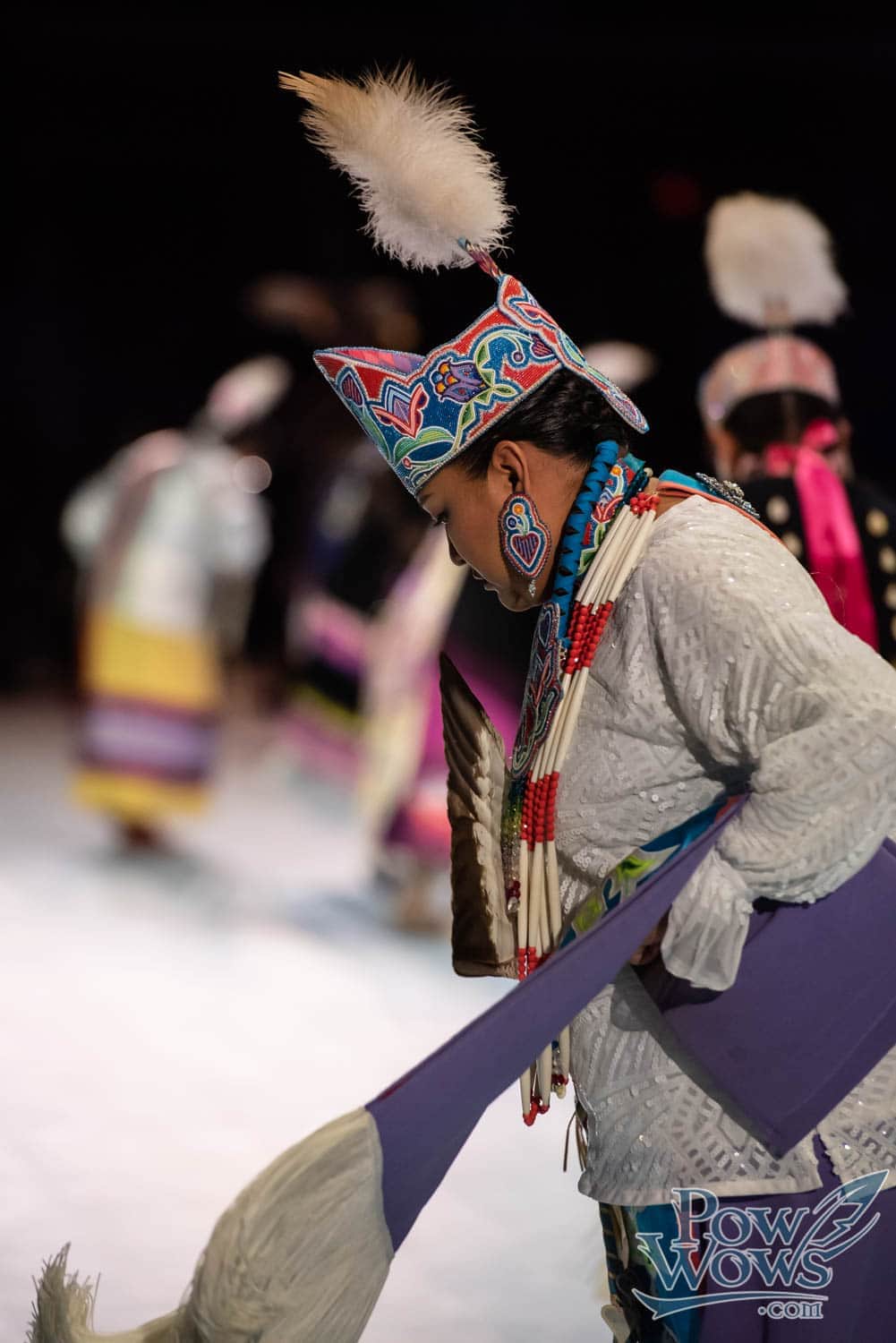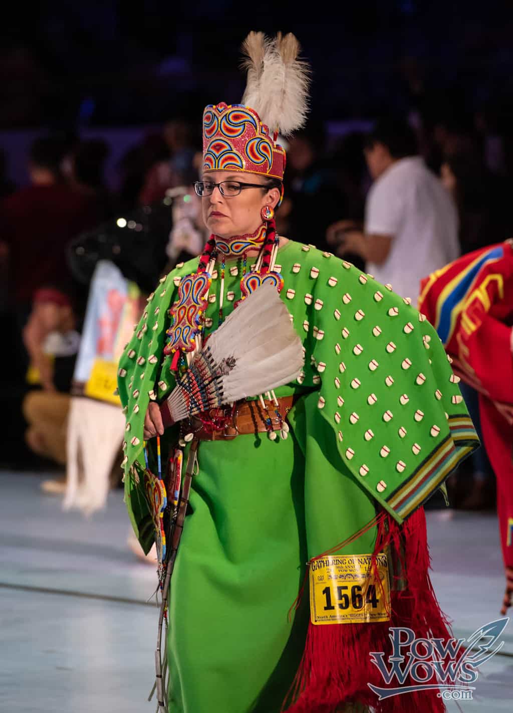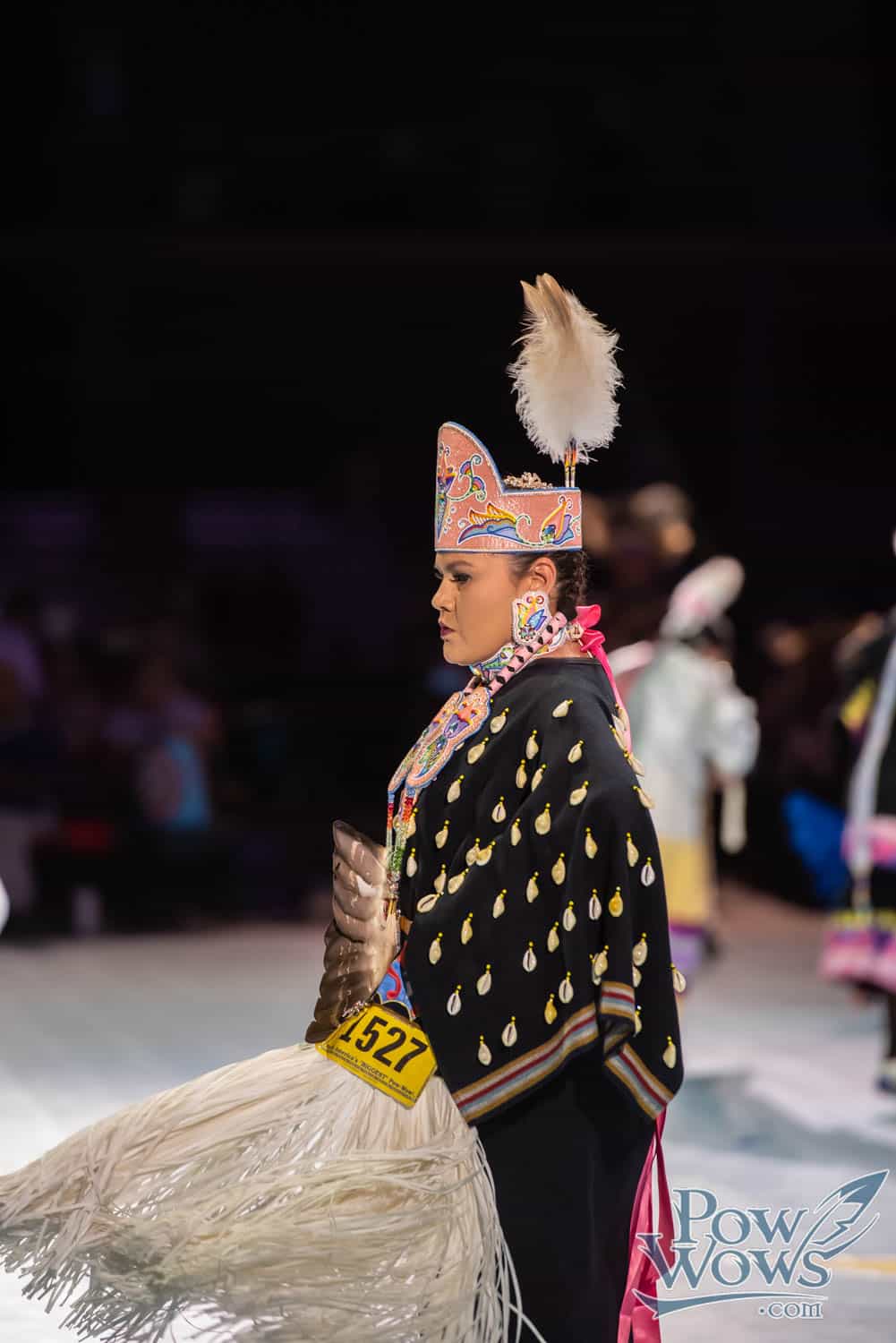There are many variations among Native American Tribes with the outfit, including wearing a cloth dress or a wool dress and others. The basic outfit consists of several parts. The boots are a high top moccasin that is usually partially beaded. The dress is a long dress with open sleeves. The bottom of the dress is covered in a wrap that is usually a contrasting color or pattern. The wrap is sometimes fringed like a shawl. This style has a breast plate similar to the buckskin dress. This breastplate however has a front and back to it as opposed to the one sided style worn by buckskin dancers. The belt is either silver conchos or beaded with a drag. The women also wear three other items on the belt. They are the awl case, strike a lite bag and tobacco pouch. The dancer sometimes wears a scarf and choker. They also will carry a fan, purse and shawl. This type of dance is a truly beautiful aspect of Native American culture.