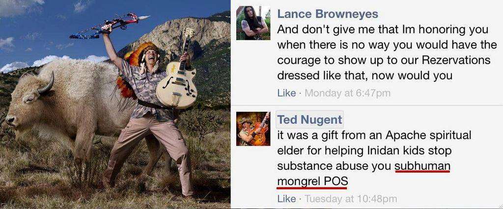 Recently Nugent has posted a photo of himself in a headdress in front of a white buffalo on his Facebook page. Many natives called him out, including Lance Browneyes. Nugent attacked Browneyes online but then quickly deleted the offending comments. But as we all know, anything that goes on the Internet lives forever. Screenshots of the comments below.